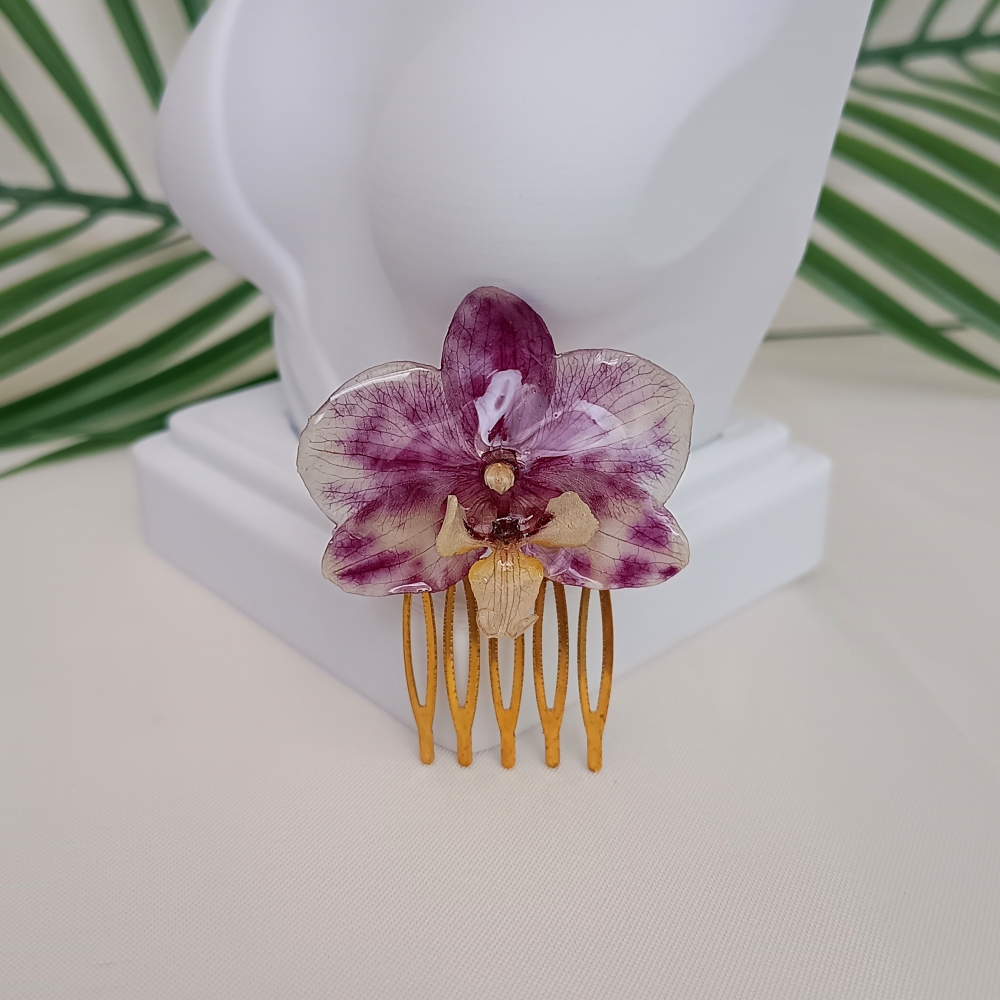 Arranjo feito com Orquídea Phalaenopsis Branca com mesclas e pintas Púrpuras, desidratada e preservada em resina epóxi.