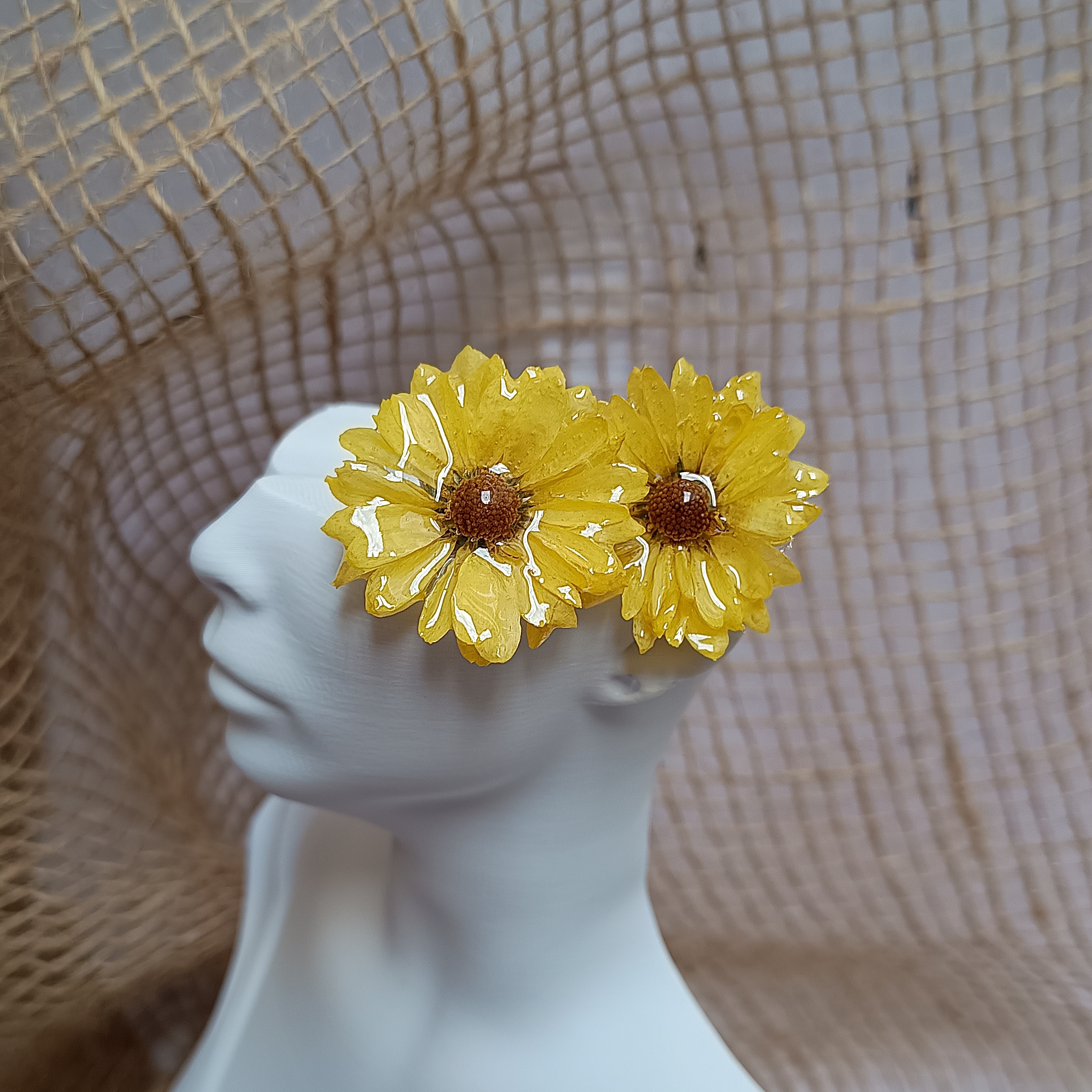 Arranjo feito com Mini Margaridas Amarelas, desidratadas e preservadas em resina epóxi.