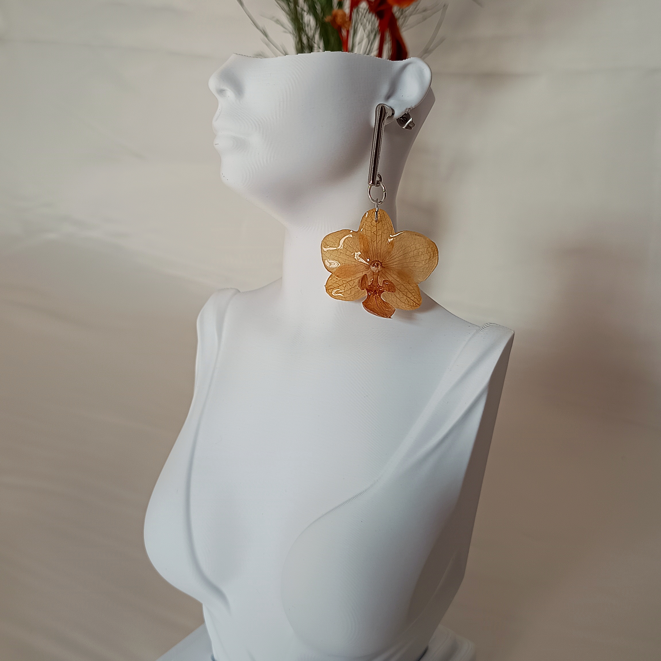 Brincos em Zamac feito com Orquídeas Amarela Amarronzada natural, desidratadas e preservadas em resina epóxi.