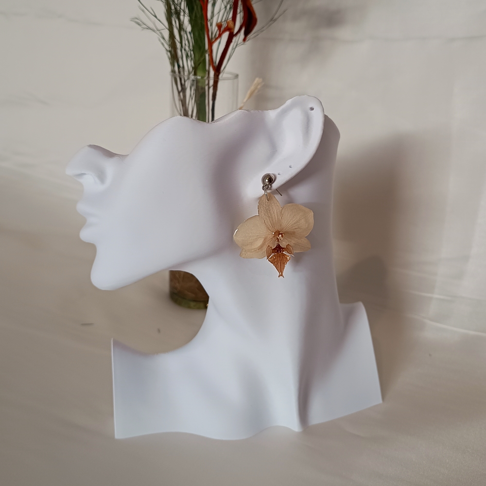 Brincos em Zamac feito com Orquídeas Branca Amarronzada natural, desidratadas e preservadas em resina epóxi.