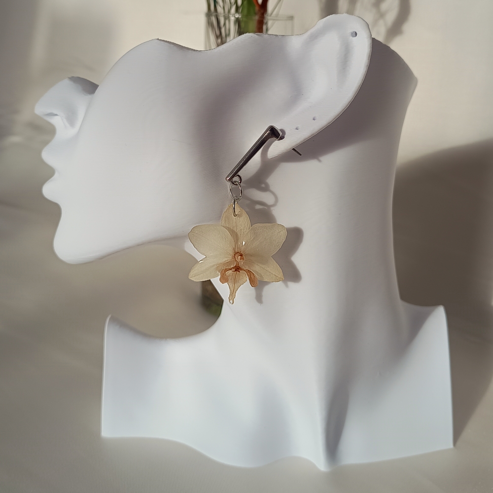 Brincos em Zamac feito com Orquídeas Branca natural, desidratadas e preservadas em resina epóxi.