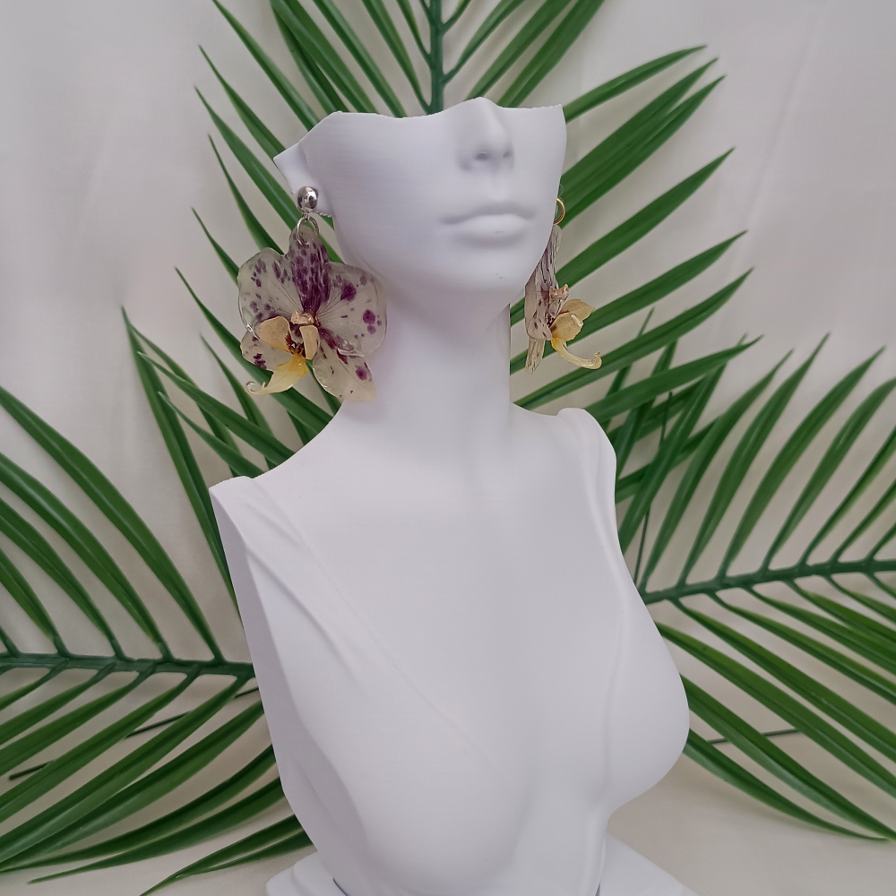Brincos em semijoas feito com Orquídeas Phalaenopsis Brancas com mesclas e pintas Púrpuras, desidratadas e preservadas em resina epóxi.