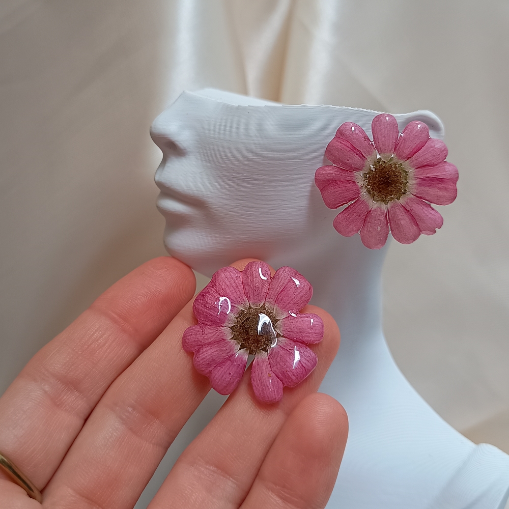 Brincos em semijoas feito com Mini Cinerárias Rosas e Brancas, desidratadas e preservadas em resina epóxi.