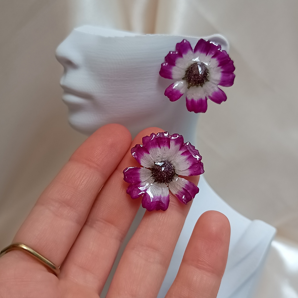 Brincos em semijoas feito com Mini Cinerárias Roxas e Brancas, desidratadas e preservadas em resina epóxi.