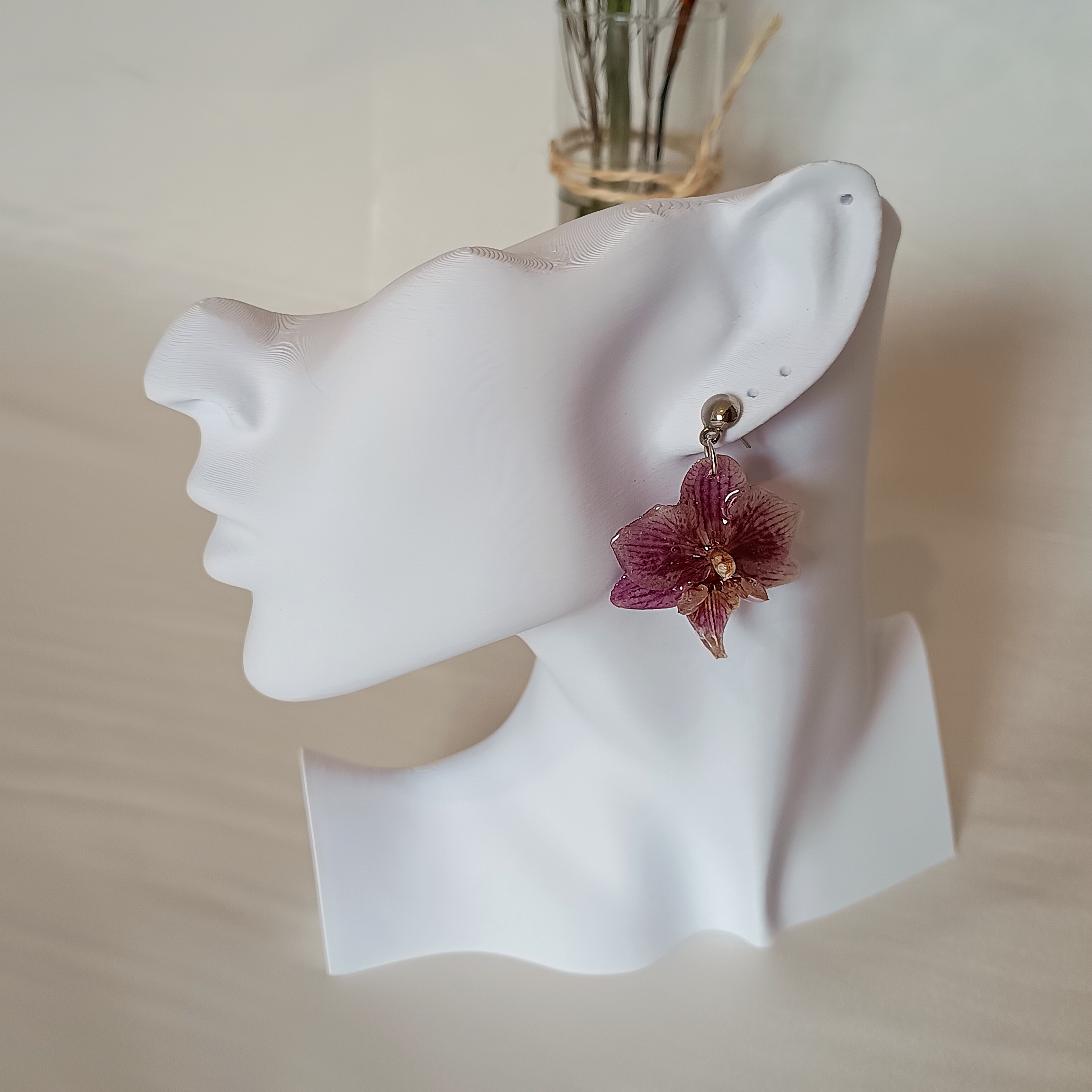 Brincos em Zamac feito com Orquídeas Roxa, desidratadas e preservadas em resina epóxi.