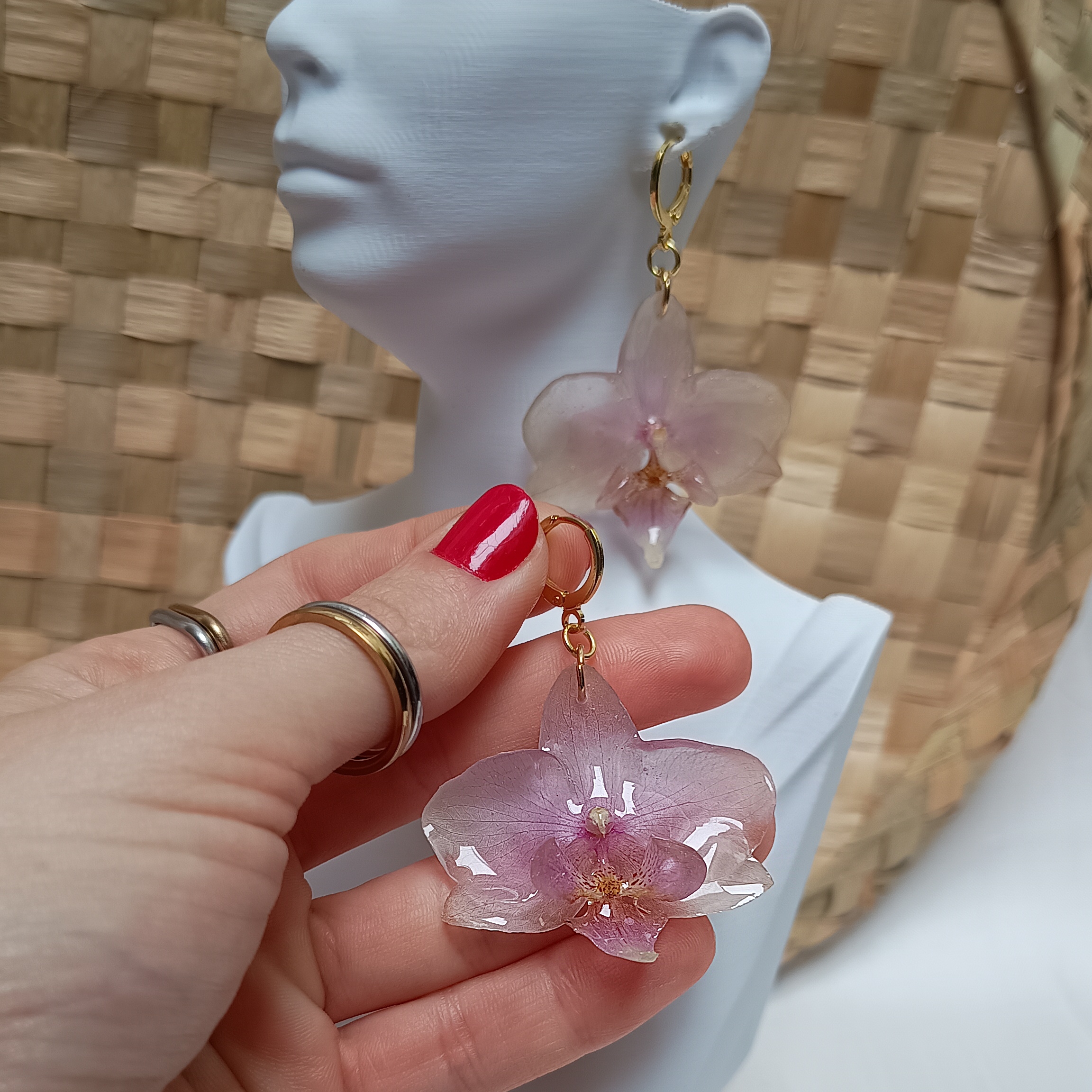 Brincos em semijoas feito com Orquídeas Mini Phalaenopsis com bordas translúscidas e centro Lilás, desidratadas e preservadas em resina epóxi.