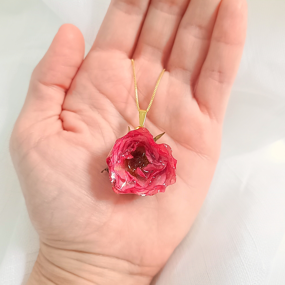 Colar com pingente feito com Mini Rosa Natural aberta, desidratada e preservada em resina epóxi nos tons rosa (Ana) e branca (Diva).