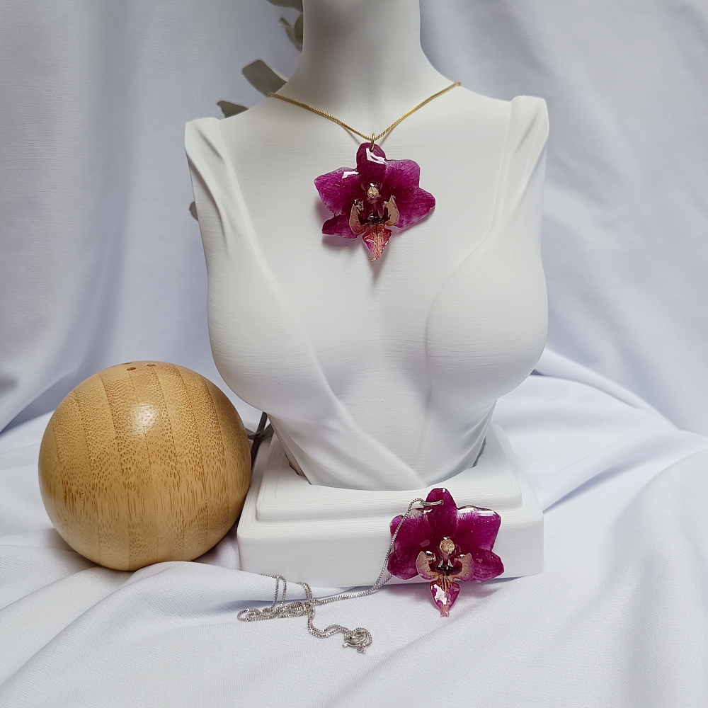 Colar em semijoas feito com Orquídea Mini Phalaenopsis Púrpura, desidratada e preservada em resina epóxi, desidratada e preservada em resina epóxi.