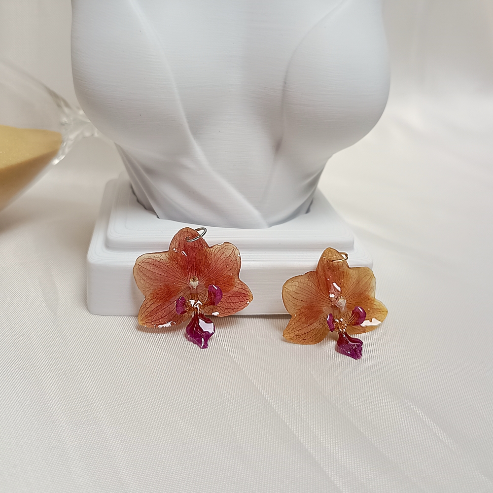 Pingente feito com Orquídea Phalaenopsis com Pétalas e Sépalas em uma mistura de Roxo e Amarelo e Labelo Púrpura, desidratada e preservada em resina epóxi.