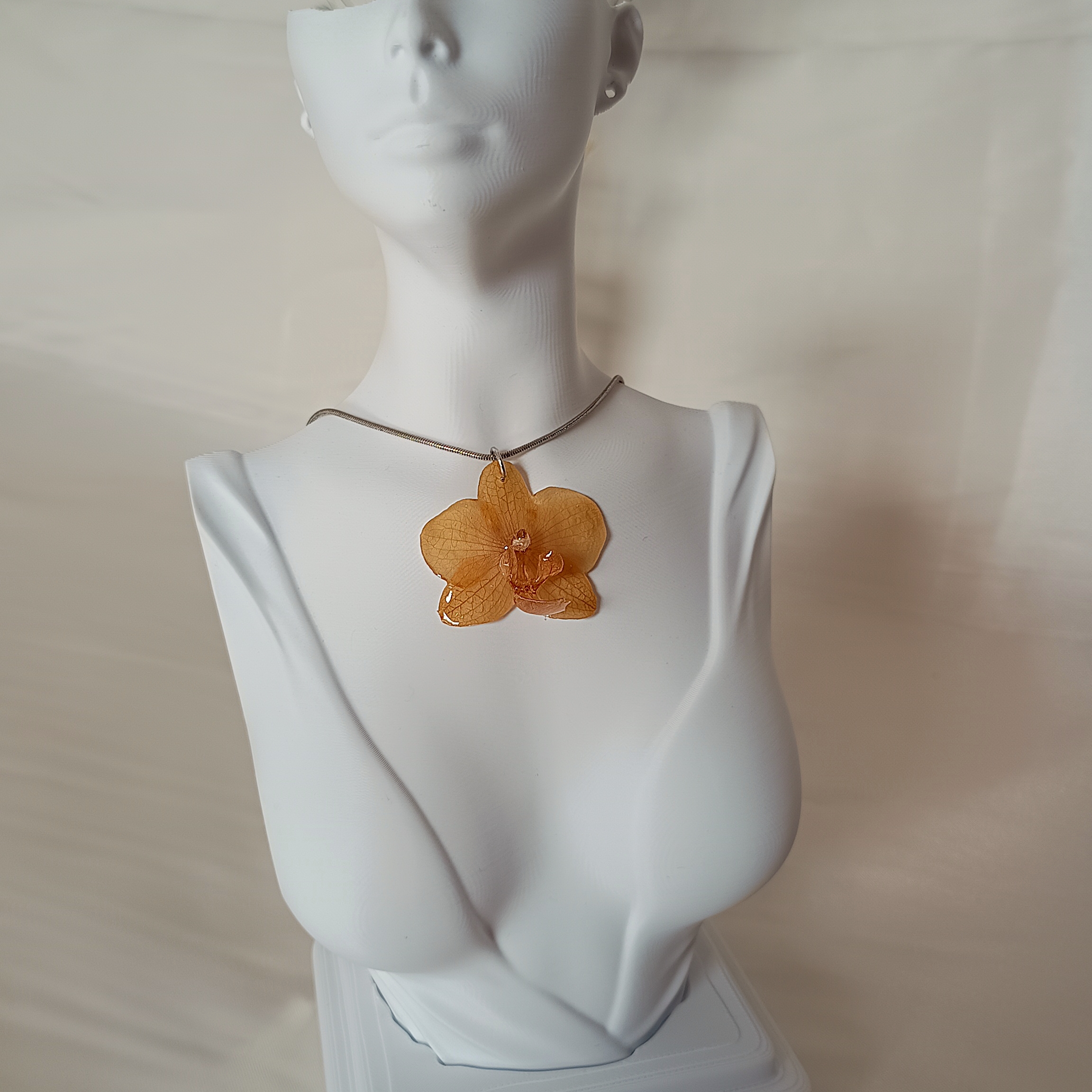Pingente feito com Orquídea Amarela Amarronzada natural, desidratada e preservada em resina epóxi.