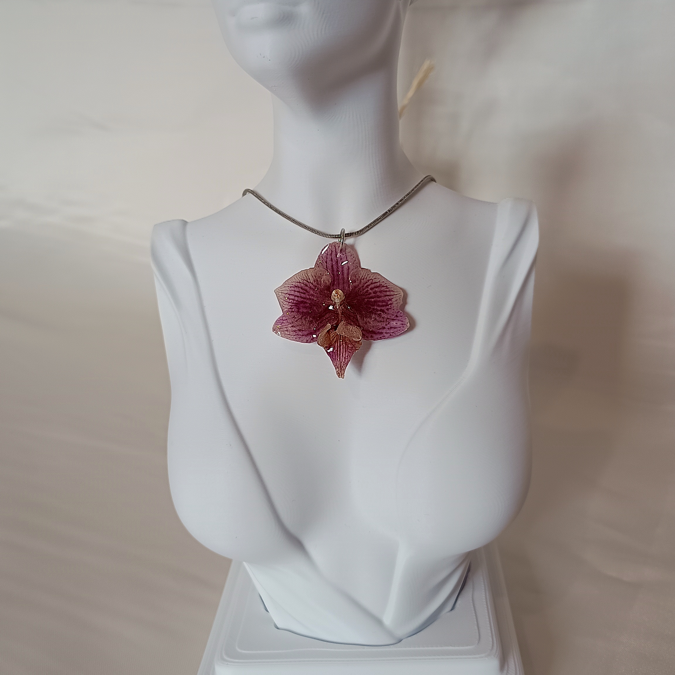 Pingente feito com Orquídea Roxa natural, desidratada e preservada em resina epóxi.