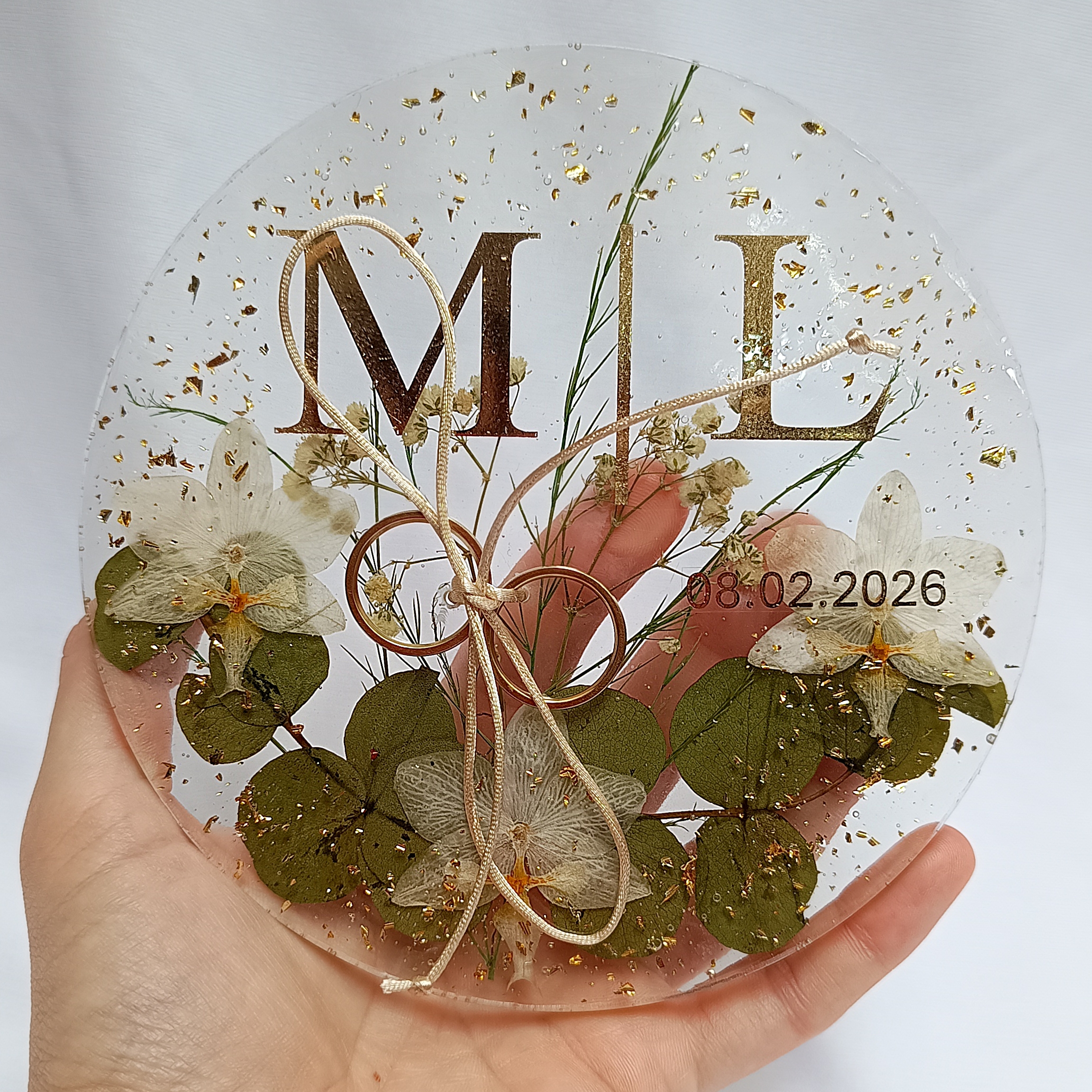 Porta-alianças com Orquídeas Branca, mosquitinho e eucalipto, desidratados e preservados em resina epóxi, decorado com iniciais ou brasão do casal e data da cerimônia. Acompanha cordão na cor marfim em cetim para amarrar as alianças.
